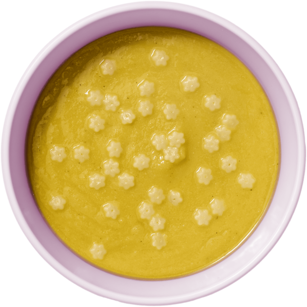Las recetas de Tiny Trocitos son cremas suaves con trocitos blandos de arroz, pasta de estrellitas y zanahoria. Todo está cocinado con el punto justo para que se pueda coger con la mano, pescar con la cuchara o chafar sin esfuerzo. Así, cada bocado ayuda a descubrir sabores y a practicar sin agobios.